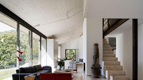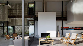 Huge amounts of house envy with this beauty... I think I have lost count of all the holiday homes I have posted about wanting, hehehe. This one is definitely in my top 5. The interior architectural detailing in the home is amazing. I adore the panoramic view that is created by the large seamless windows... perfect! The mix of materials work so effortlessly with each other to create a well balanced comfortable environment. The steel post interlocking the concrete bench perfectly breaks up this open space, to cleverly separate the living area with the kitchen/dining area.